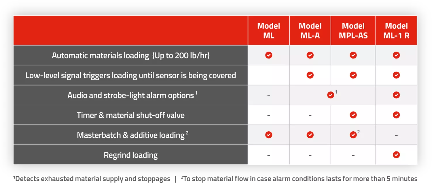 - All ML models can automatically load material at rates of up to a maximum of 200 lb/h (90 kg/h), based on beside the press conveying distances of 6 to 9ft (2 to 3m), conveying materials of a normal bulk density.